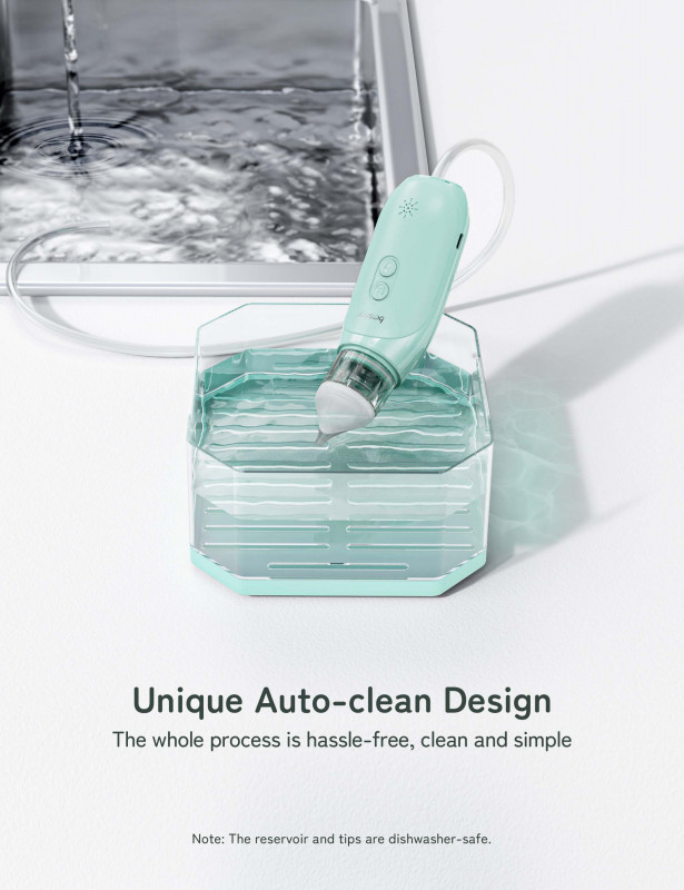 Mécanisme de nettoyage automatique : l'aspirateur nasal pour bébé avec un tube de vidange vous apportera un nouveau niveau et une expérience de lavage moins pénible. Remarque : Les pièces amovibles passent au lave-vaisselle, le corps de la machine n'est pas étanche