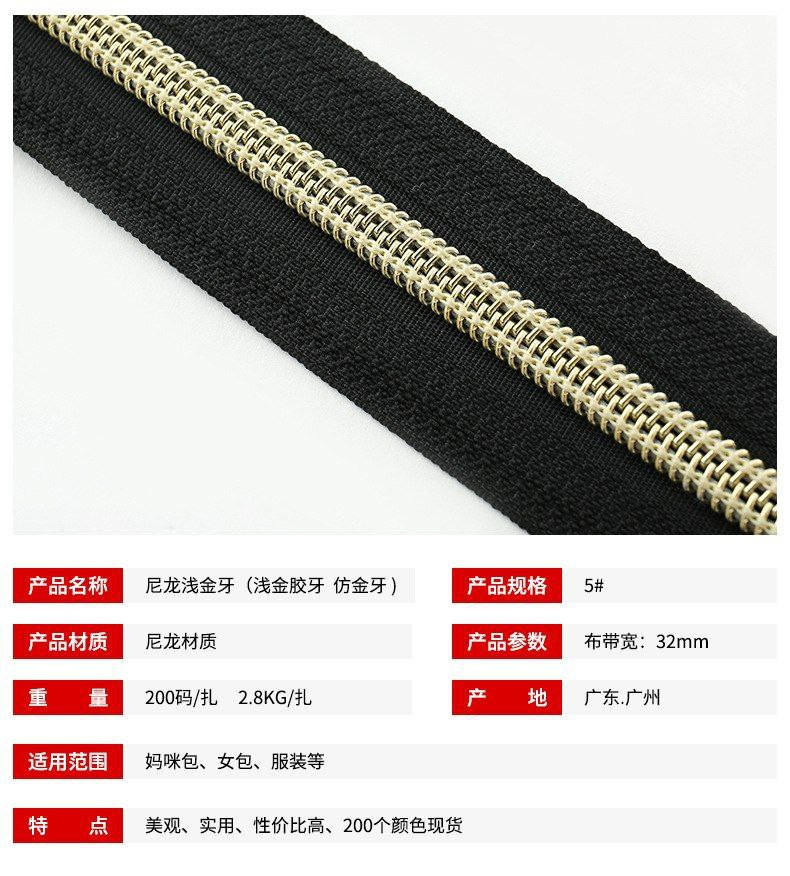 Fermeture à glissière en nylon panaché n ° 5 or clair Dents en or clair Dents plaquées sous vide
