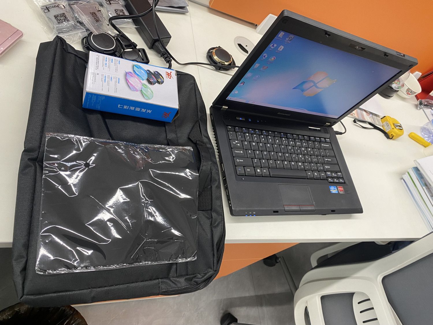 Tous les accessoires disponibles dans le carton y compris le sac, la souris, le chargeur, la nappe de souris...