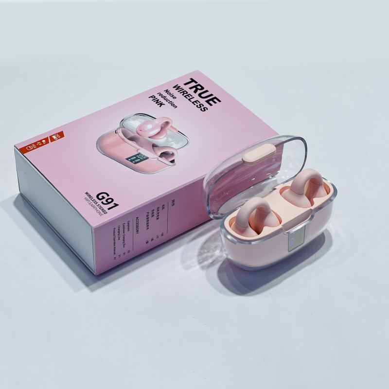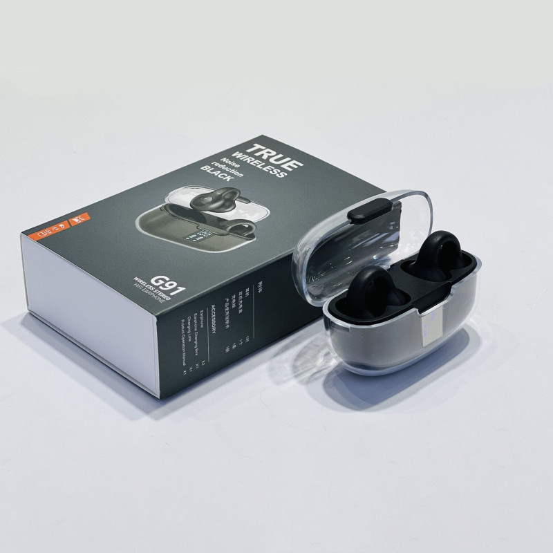 Ecouteurs Bluetooth G91 sans fil OWS avec boîtier transparent, fonction anti-bruit, affichage numérique, conçu pour le sport et la musique, idéal pour les environnements de sport et les appels téléphoniques.